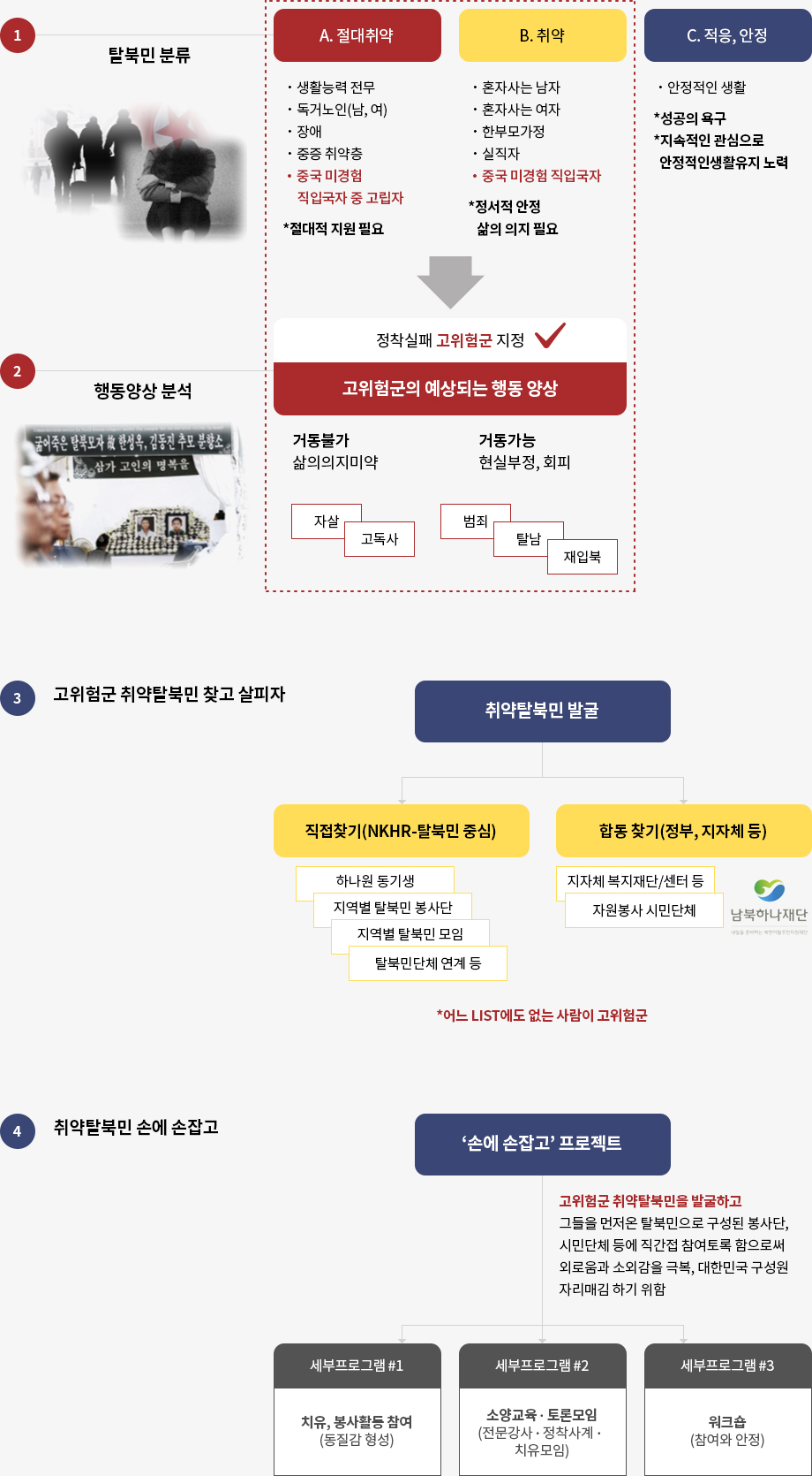 고위험군 취약탈북민을 발굴하여 그들이 마음을 열 수 있는 단체에 직간접적으로 참여토록 함으로써 외로움과 소외감을 극복하고, 한국사회 구성원으로 자리매김할 수 있도록 지원이 필요합니다.